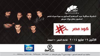 تحيي فرقة الروك العربي "كود مصر" مساء 19 مايو الجاري، حفلًا غنائيًا على مسرح قاعة النهر بساقية الصاوي الثقافية. ويتضمن برنامج الحفل أغنيات "سر ضحكي، مجنون، باحلم، باغني للحياة، نصبوا الصوان، صوتي أنا ...