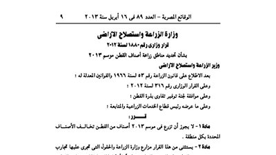 أصدرت وزارة الزراعة واستصلاح الأراضى، قراراً تحظر فيه زراعة أصناف معينة من "الأرز"، مثل صنف الأبلانك الأمريكى وأن تتم زراعة ( الجيزة \92) فى محافظة دمياط طبقاً للمساحات المتعاقد عليها، ويزرع (جيزة ...